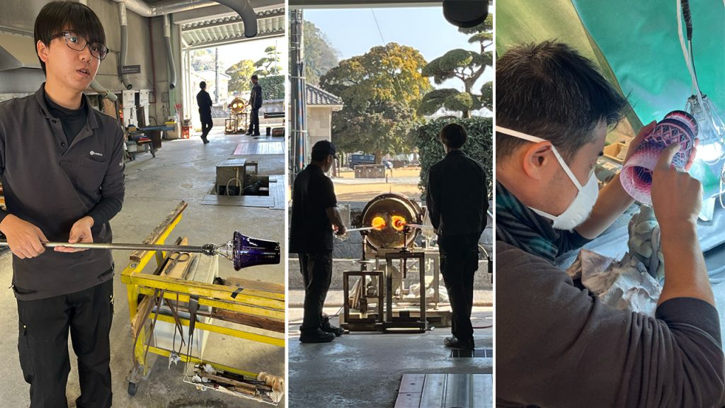 Right next-door is the Satsuma Kiriko Gallery and adjoining glassworks factory, where young master glassblowers and engravers let you watch the entire process, even responding to questions from visitors thrown at them randomly from behind the knee-high guide ropes separating us from the intense heat of their factory floor.