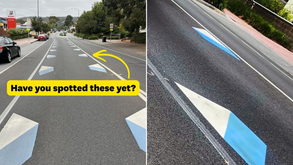 The markings, nicknamed “dragon’s teeth”, are blue and white triangles designed to look 3D and signal a change in road conditions, including a lower speed limit. They are being trialled in Adelaide as part of a University of Adelaide Automotive Safety Research study in partnership with the Department of Transport.