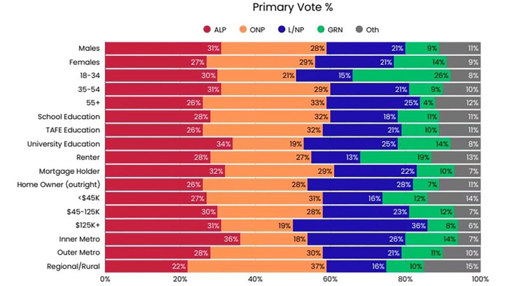 The same polling suggests One Nation is also strongest among Australians aged 55-plus, people without a university education, and those earning under $45,000. It performed best in outer metropolitan and regional or rural areas, and was tied for first place with the Coalition among outright homeowners.