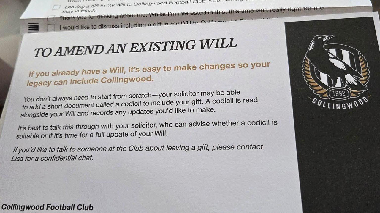 The letter tells recipients it is “easy to make changes” to their will “so your legacy can include Collingwood”, and many fans felt the timing and tone were deeply insensitive.