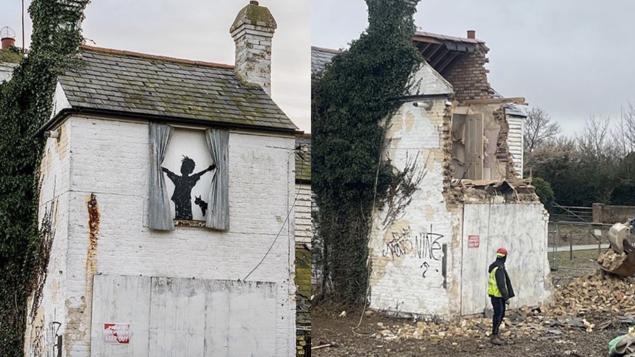 Banksy mural on the side of dilapidated farmhouse destroyed