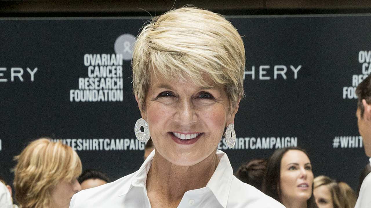 Julie Bishop struts the red carpet in daring red gown – and debuts new hairstyle