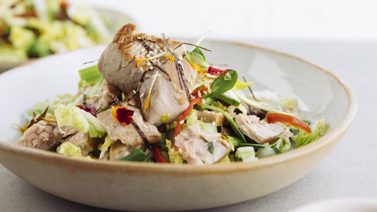 From a series of recipes by Xali: Seared Tuna with Asian Slaw Sesame & Naz’s sesame Dressing