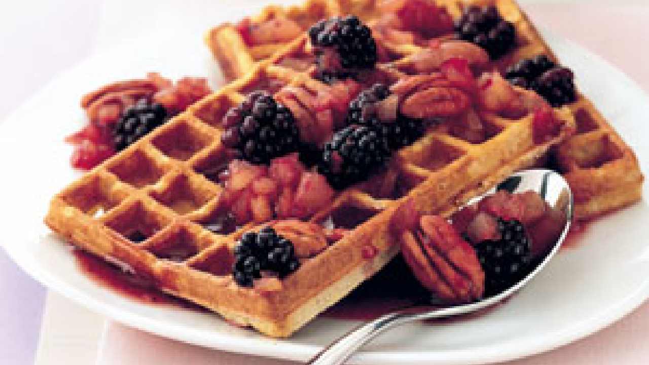 Pecan waffles with maple and blackberry sauce