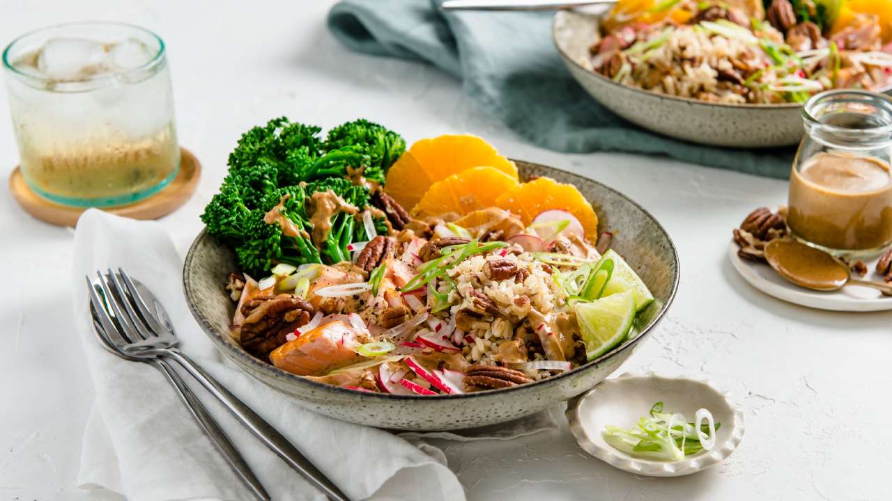 Pecan, broccolini & salmon grain bowl