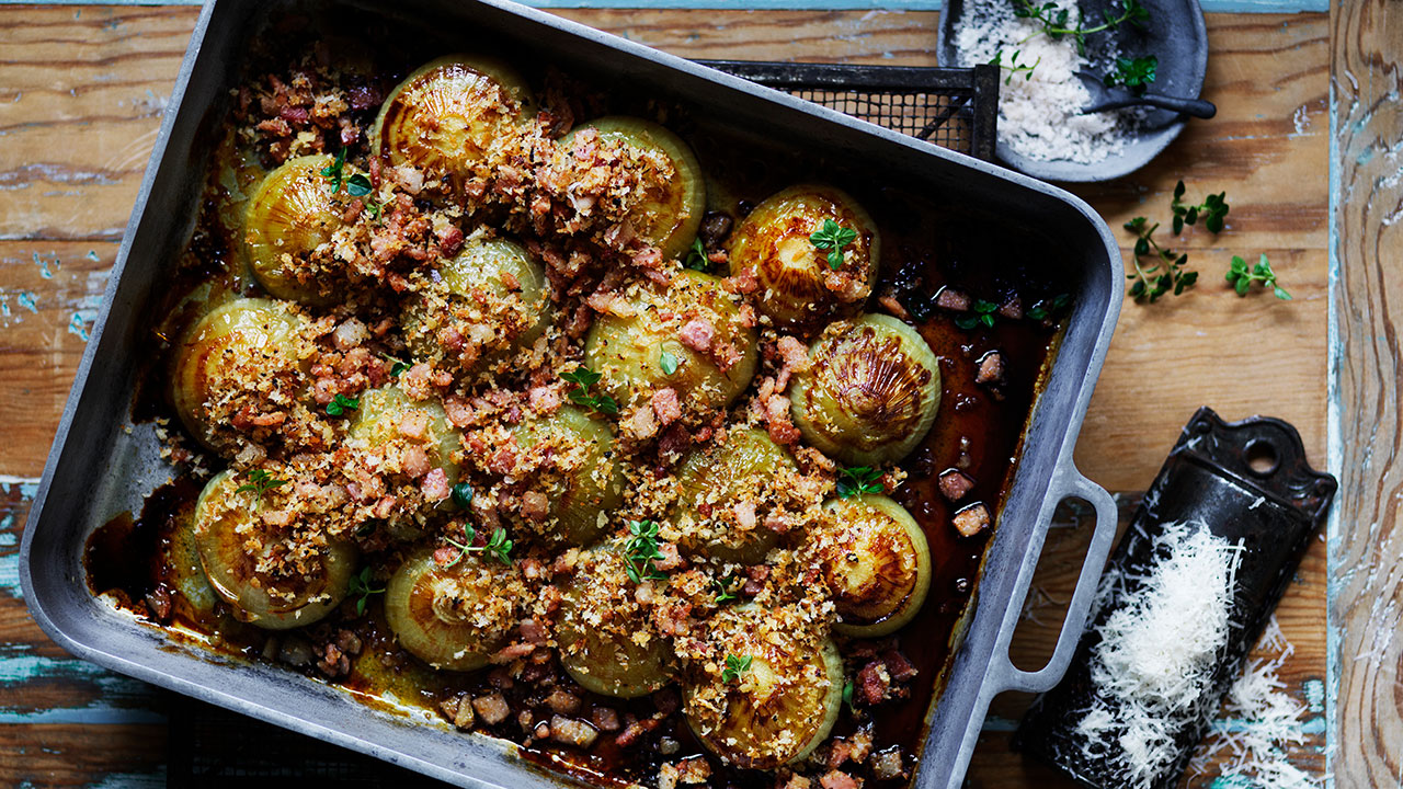 Slow roasted onions with cheesy bacon crumble