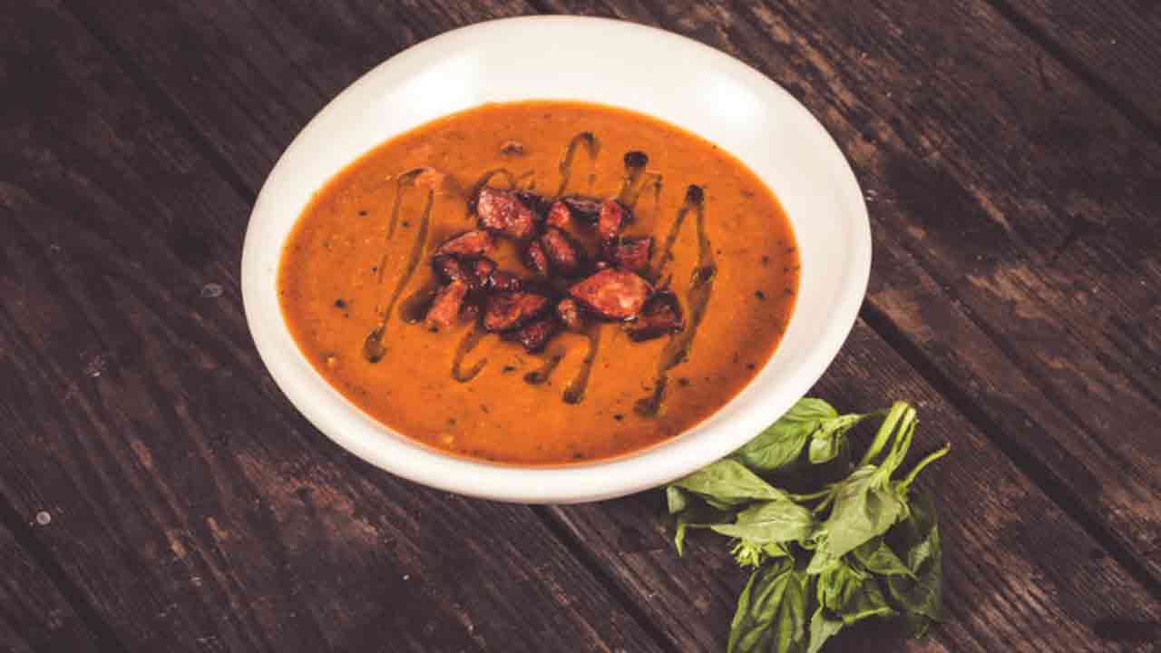 Delicious roast tomato and capsicum soup with crispy chorizo and fresh basil