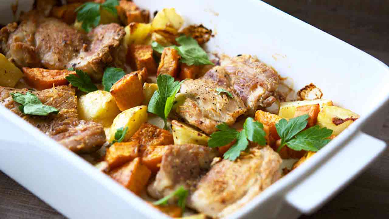 Hearty Chicken and root vegetable tray bake